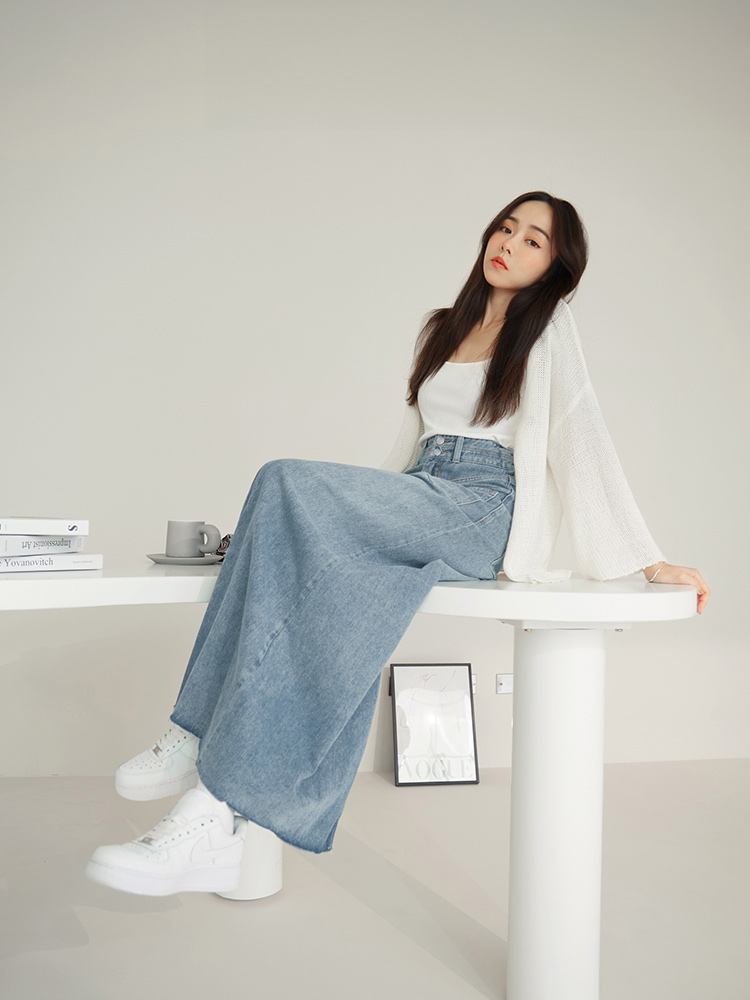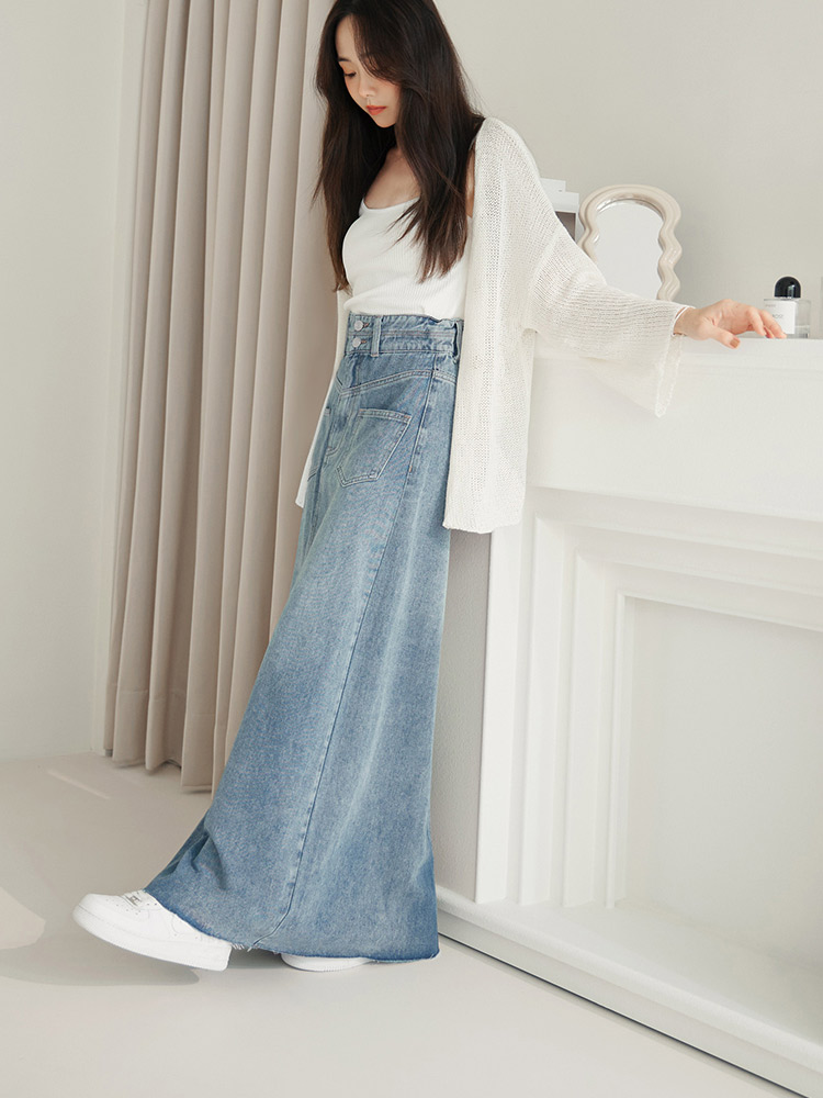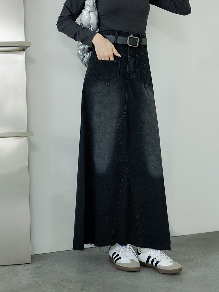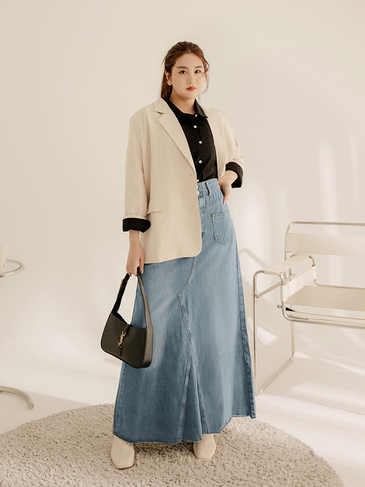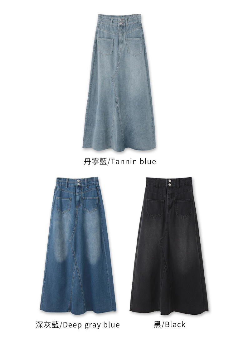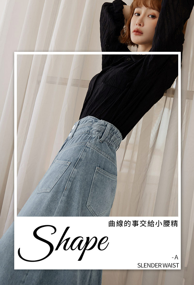Product Feature: โ Crafted from soft, breathable cotton denim โ Flattering A-line silhouette for a streamlined look โ Features a wide button-up waistband for a sleek, slimming effect โ Designed with functional front and back pockets