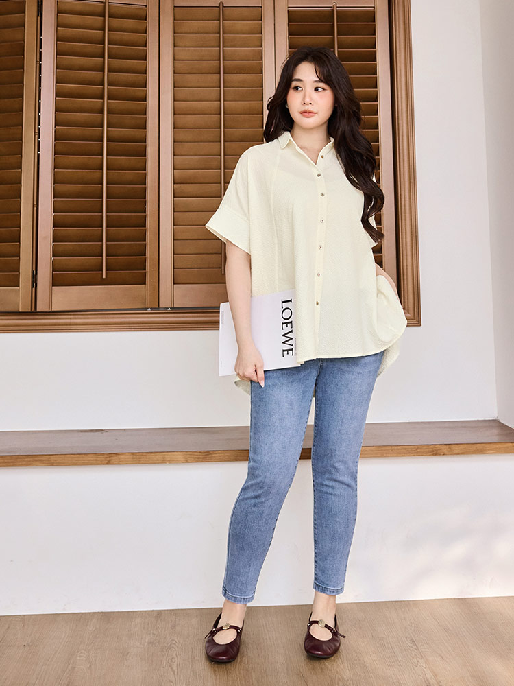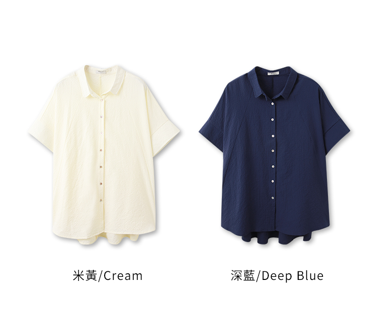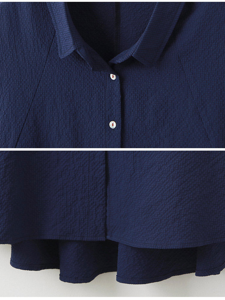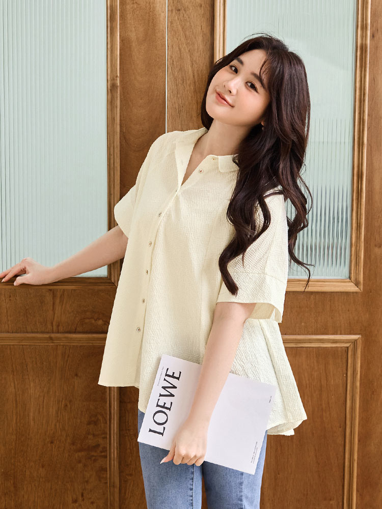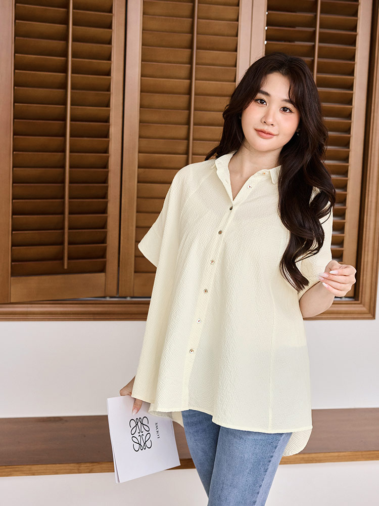 Product Feature: โ Crafted from soft, skin-friendly bubble gauze fabric. โ Features a flattering peplum hem that skims the hips. โ Designed with a button-front closure. โ Loose sleeves offer comfortable arm coverage.