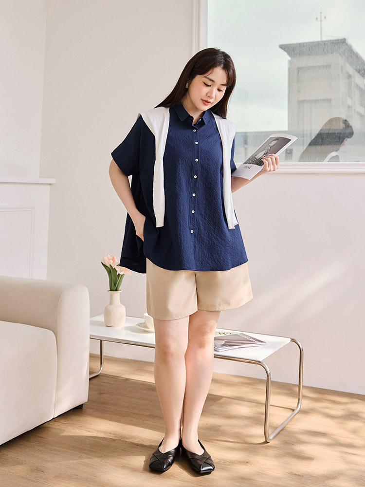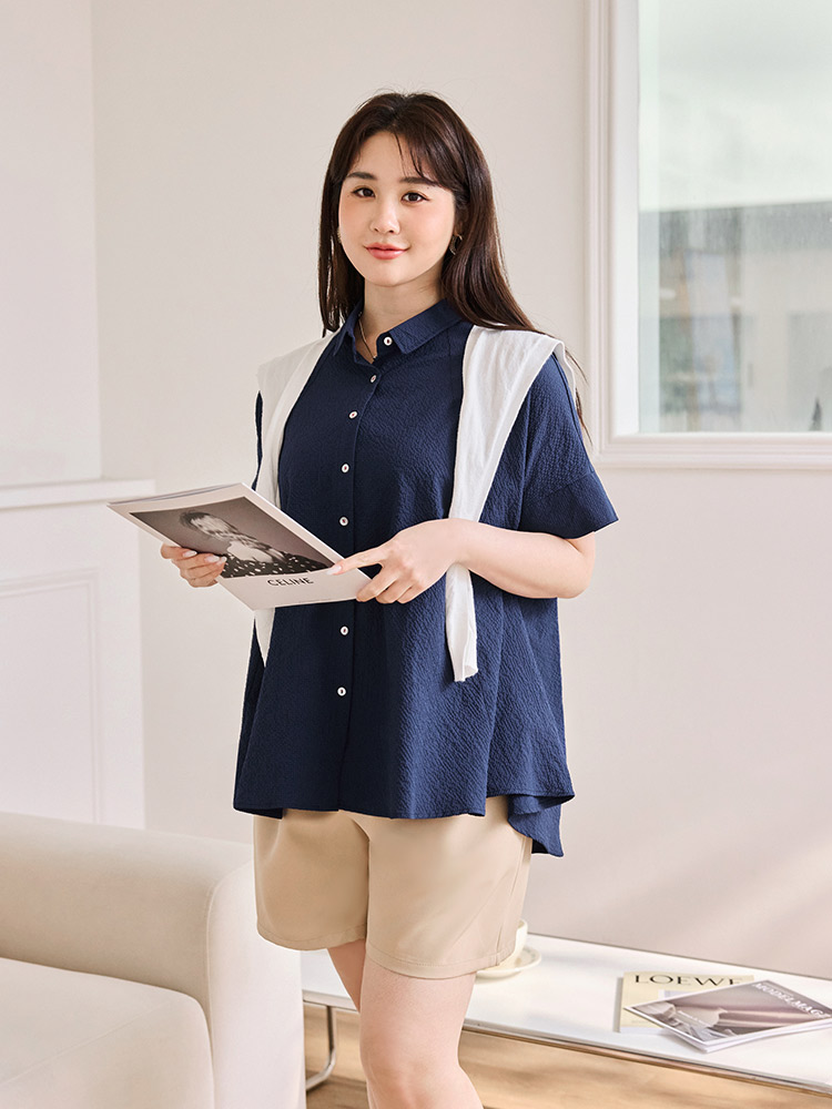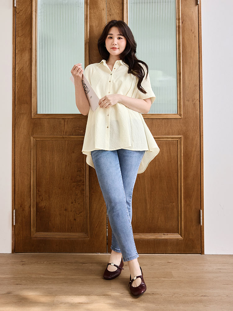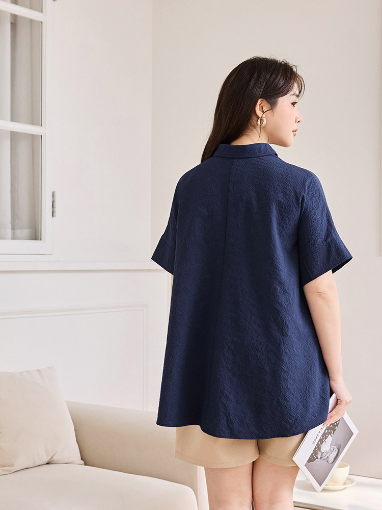 Product Feature: โ Crafted from soft, skin-friendly bubble gauze fabric. โ Features a flattering peplum hem that skims the hips. โ Designed with a button-front closure. โ Loose sleeves offer comfortable arm coverage.
