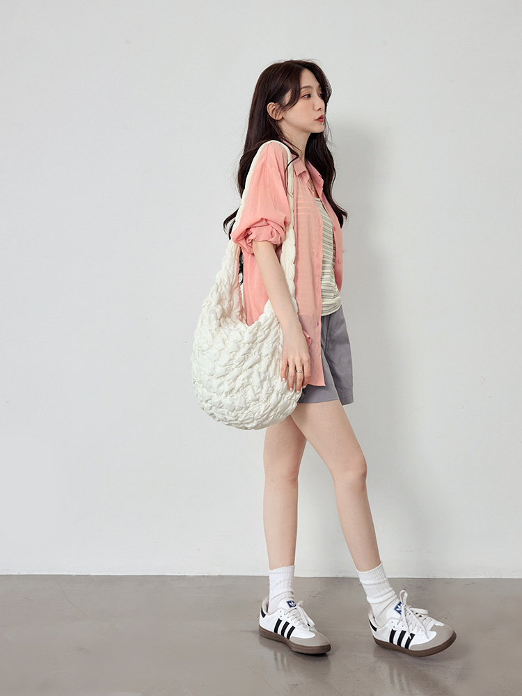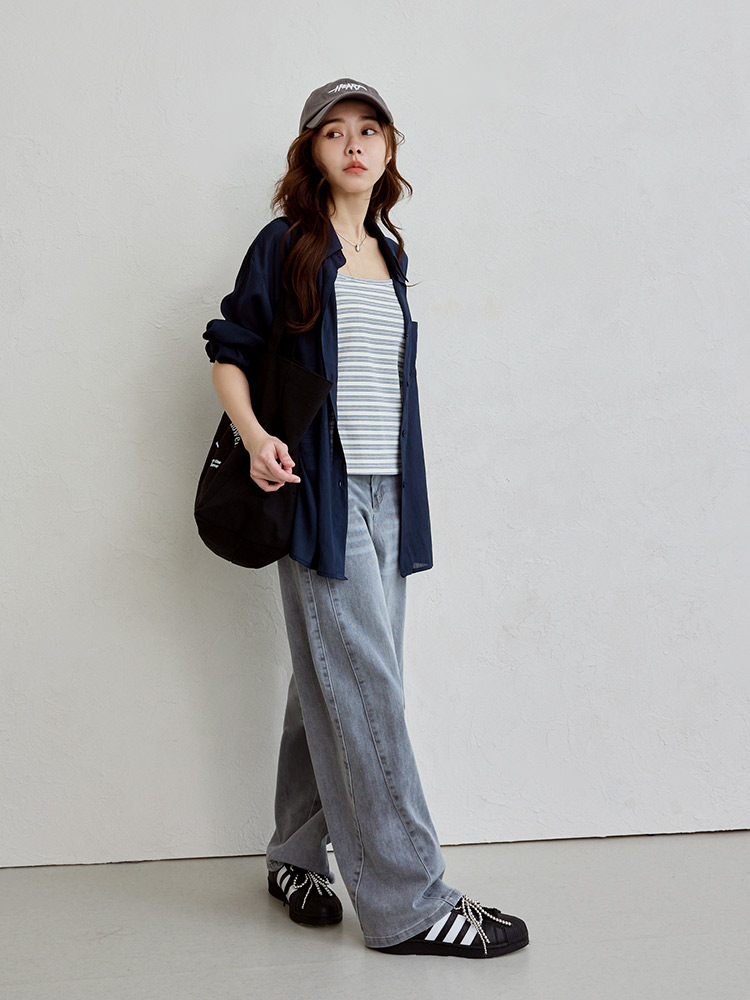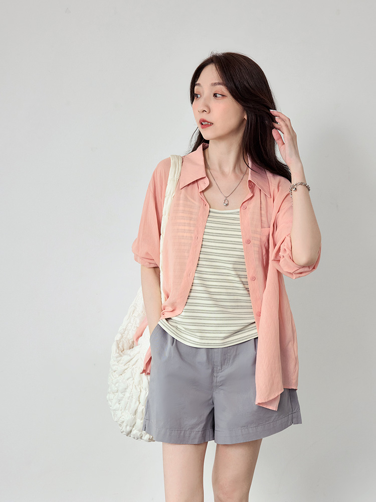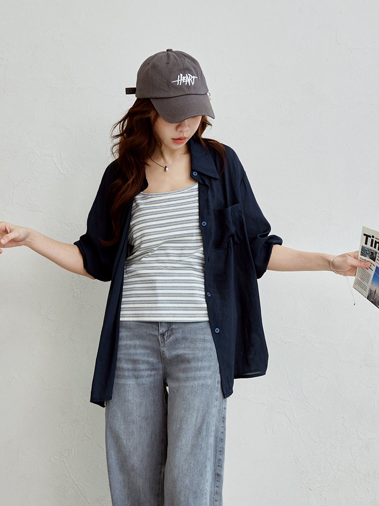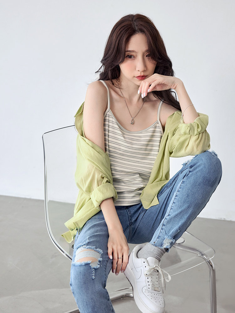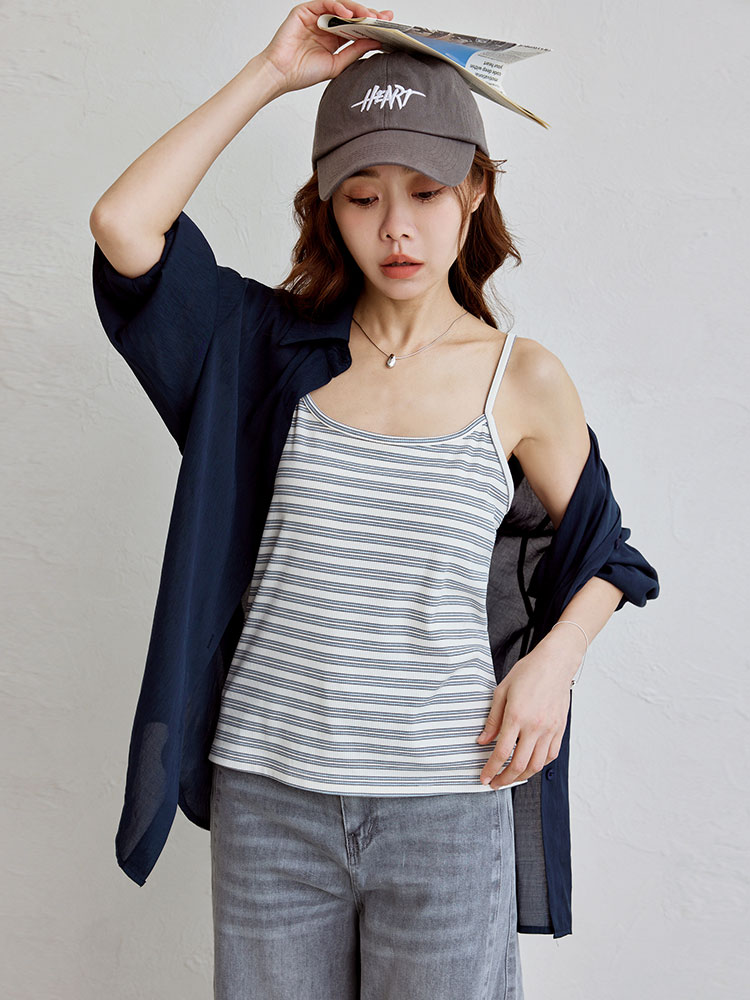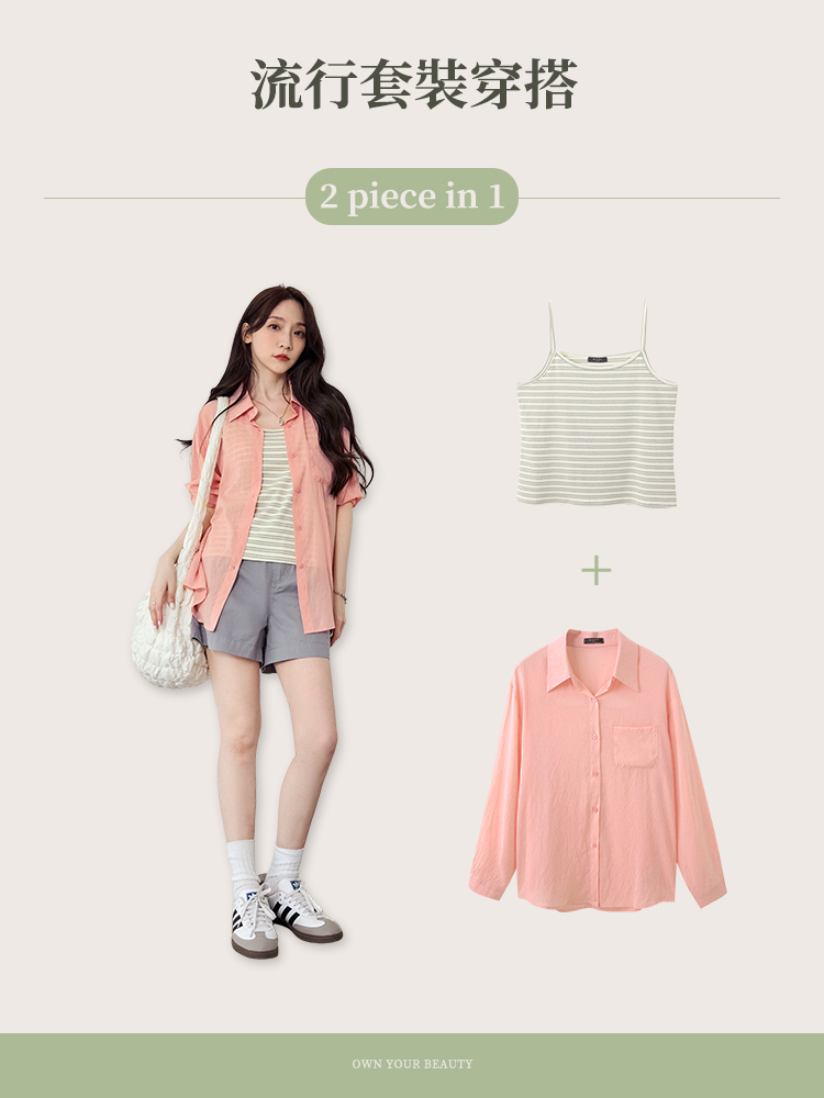 Product Feature: โ Features a versatile two-piece design for multiple styling options. โ Includes a fitted, striped cami. โ The outer layer has a functional front pocket. โ The shrug has a button-down front with a back opening for breathability.