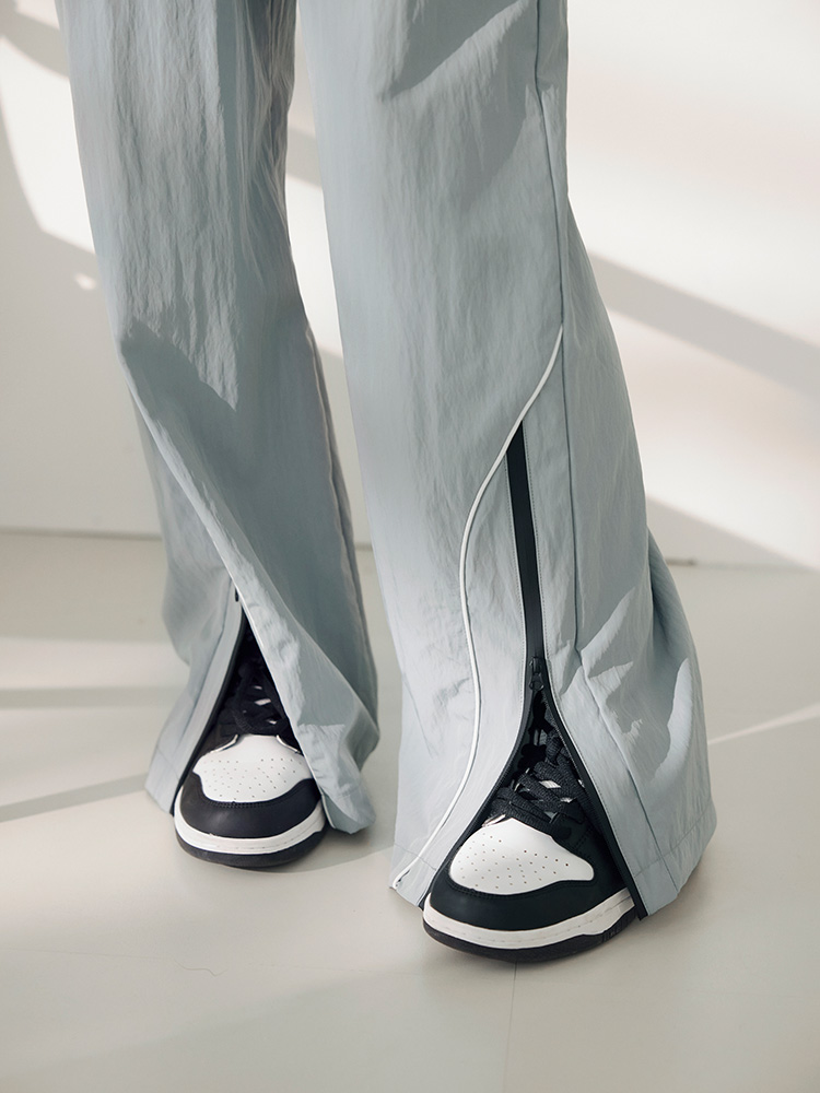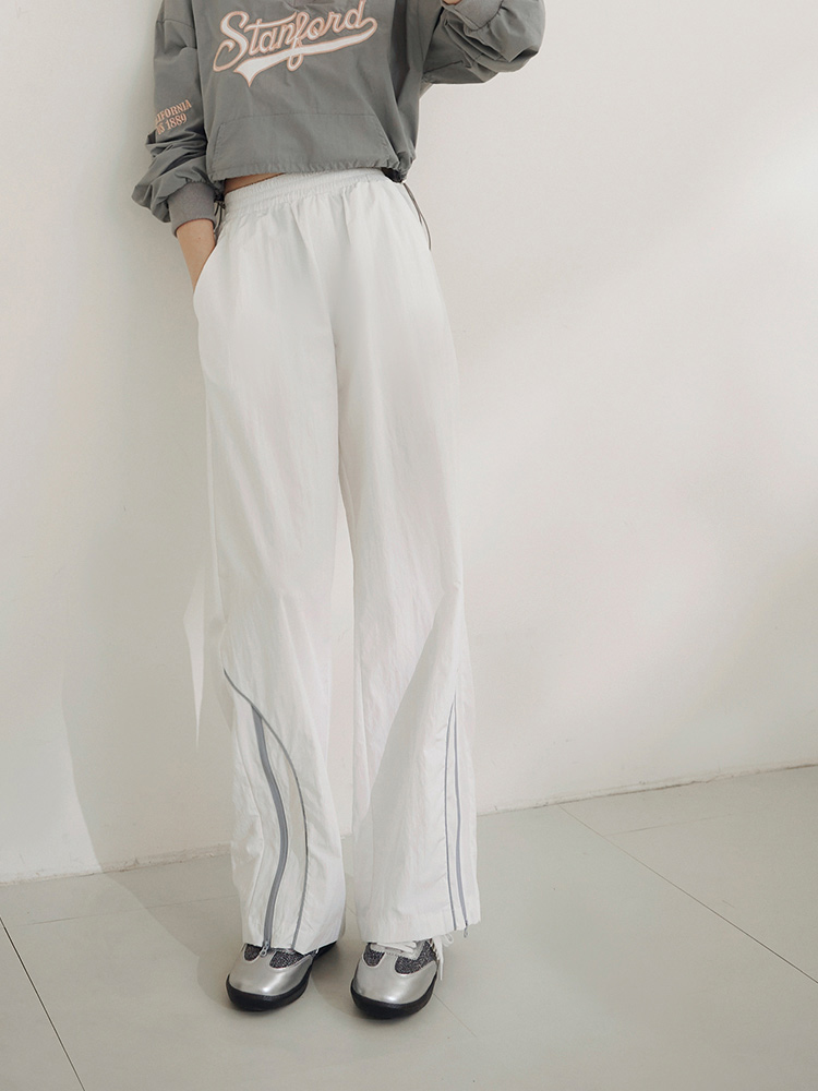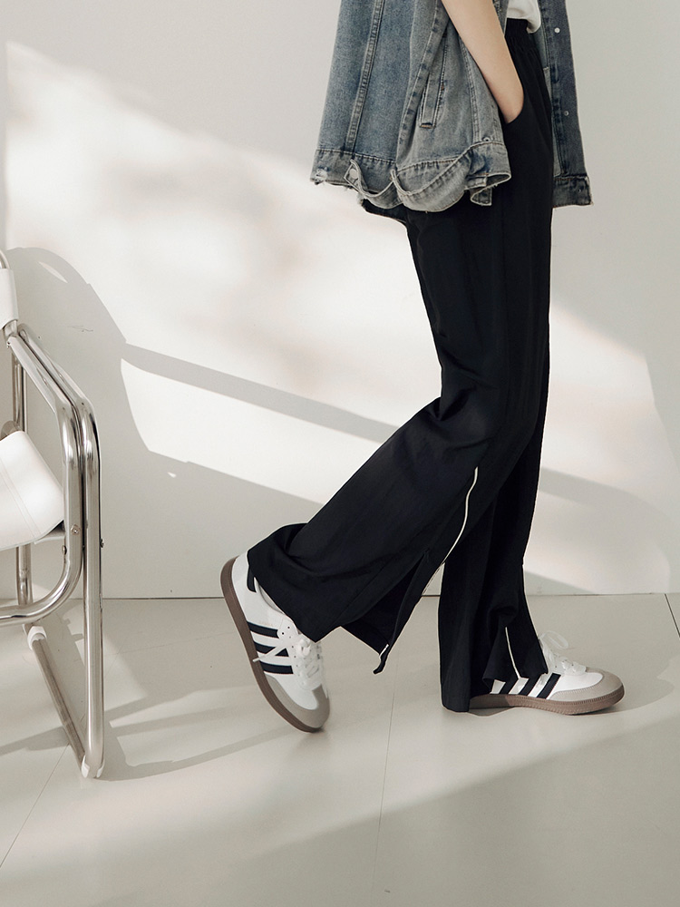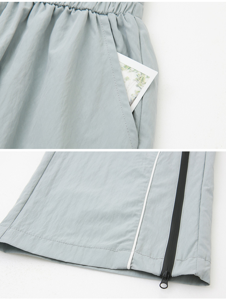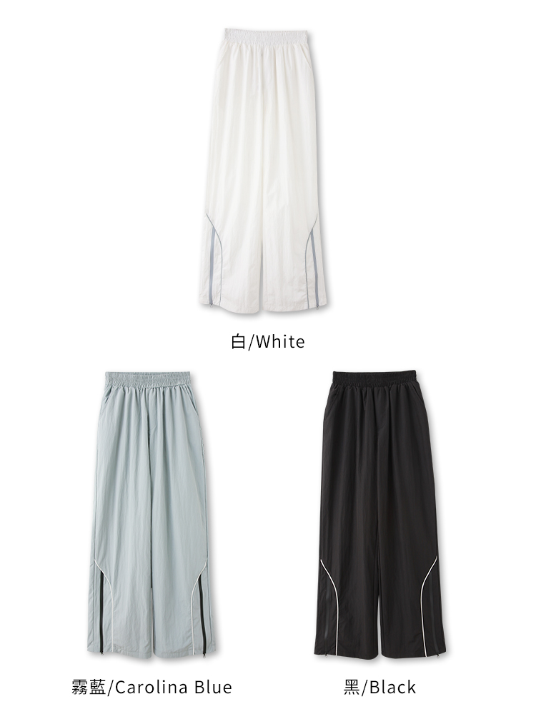 Product Feature: โ Features a streamlined colour-block trim design โ Crafted from lightweight, comfortable fabric โ Equipped with practical side pockets โ Split-hem design to flatter the legs โ Full elastic waistband for a comfortable fit โ Includes zip-up hems