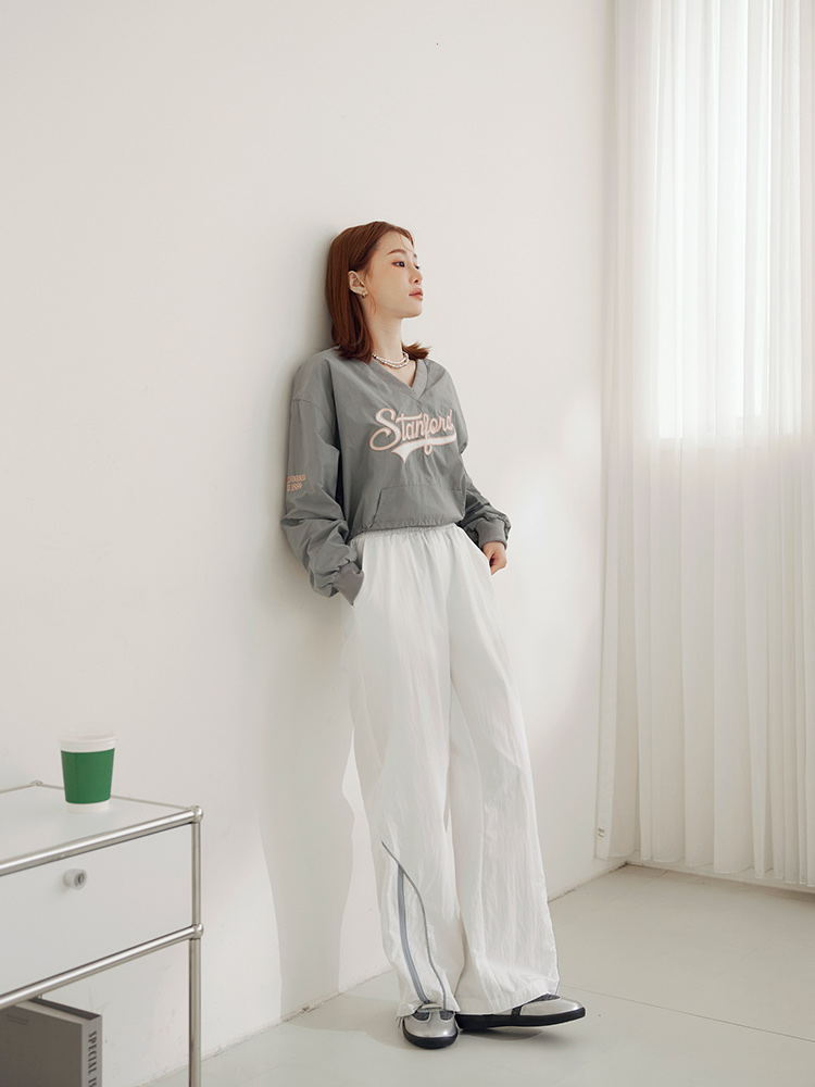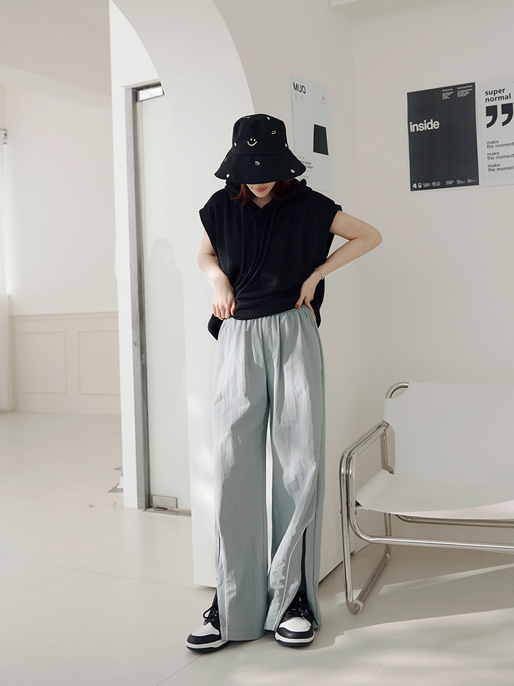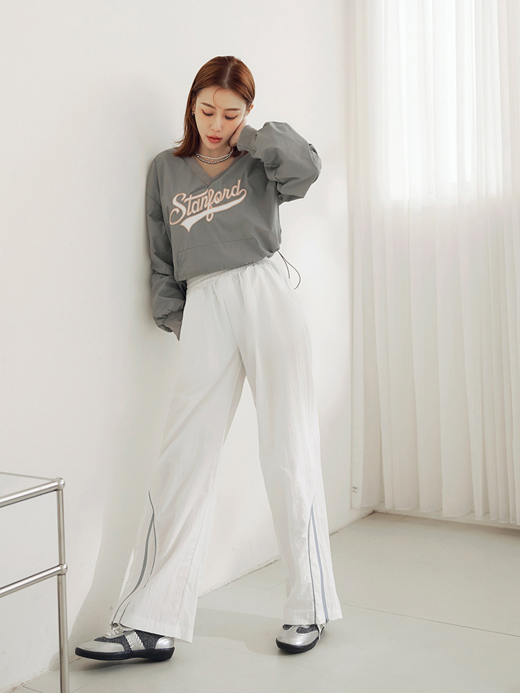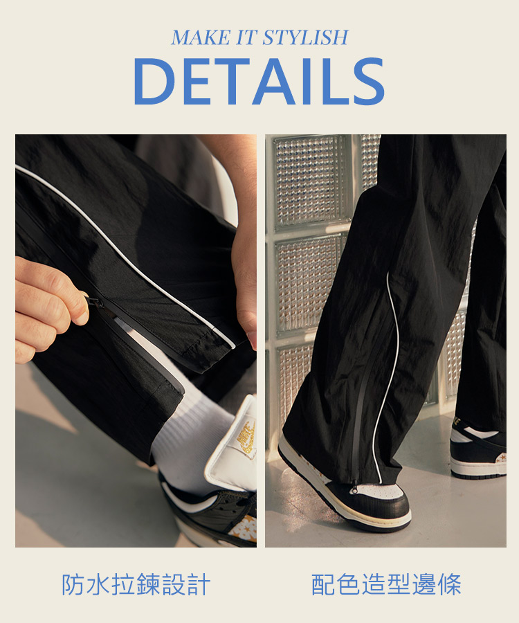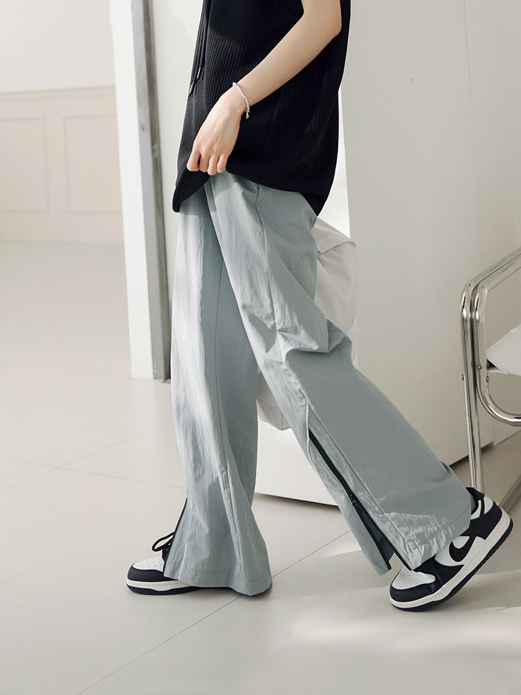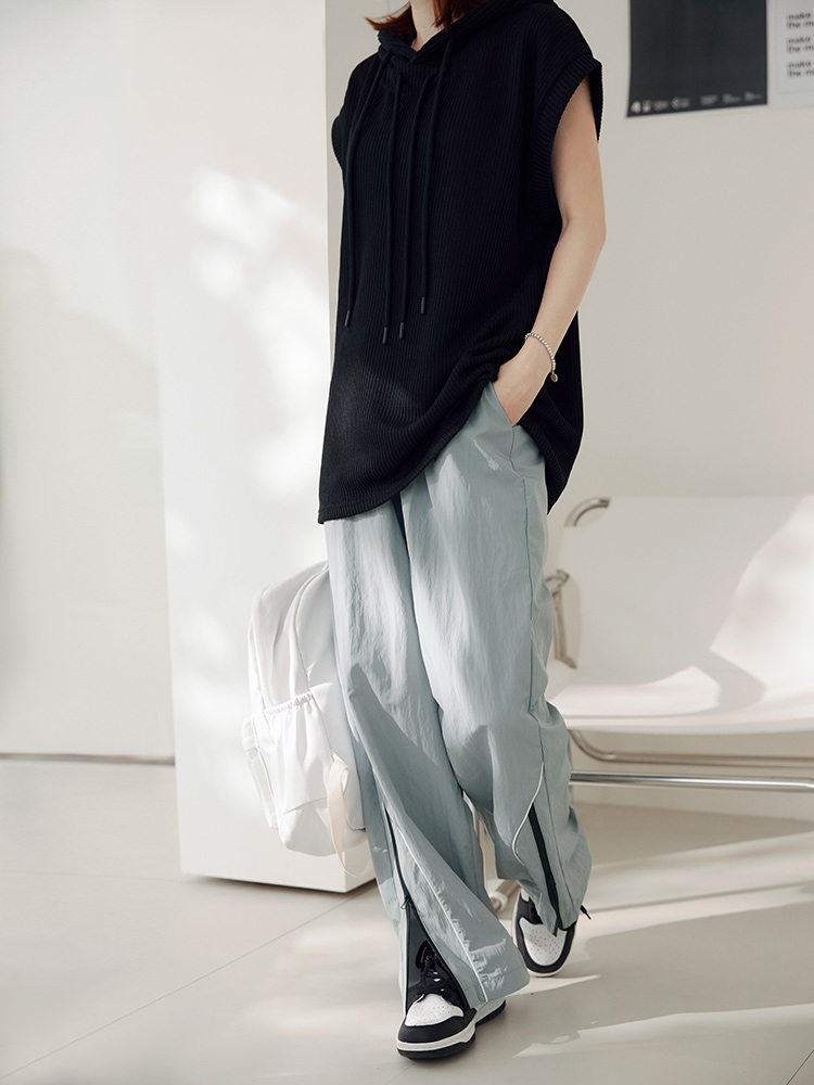 Product Feature: โ Features a streamlined colour-block trim design โ Crafted from lightweight, comfortable fabric โ Equipped with practical side pockets โ Split-hem design to flatter the legs โ Full elastic waistband for a comfortable fit โ Includes zip-up hems