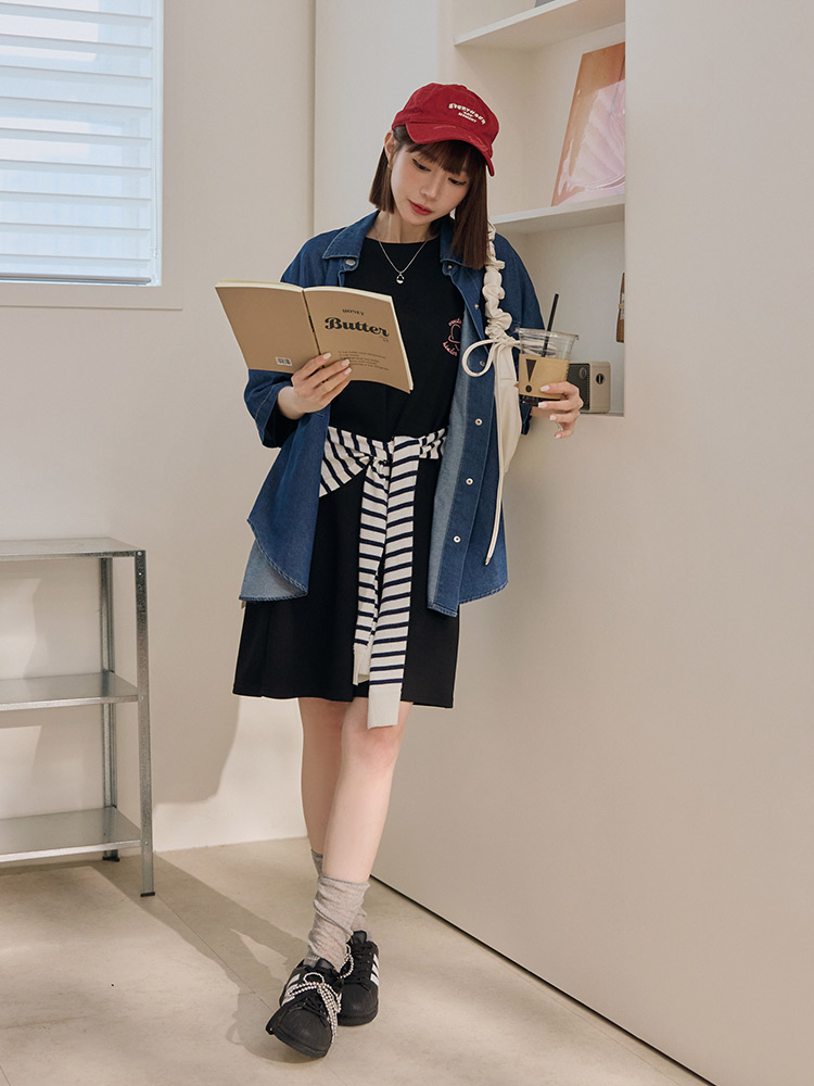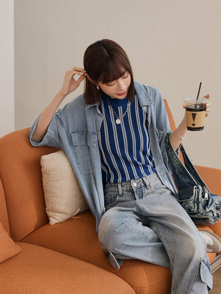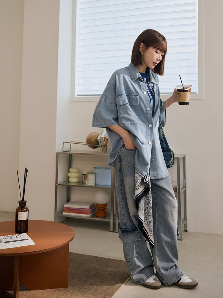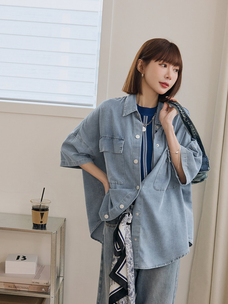 Product Feature: โ Crafted from soft, skin-friendly cotton denim โ Features two functional chest pockets โ Relaxed, loose fit with dropped shoulders for a casual look โ Classic button-up design for easy wear