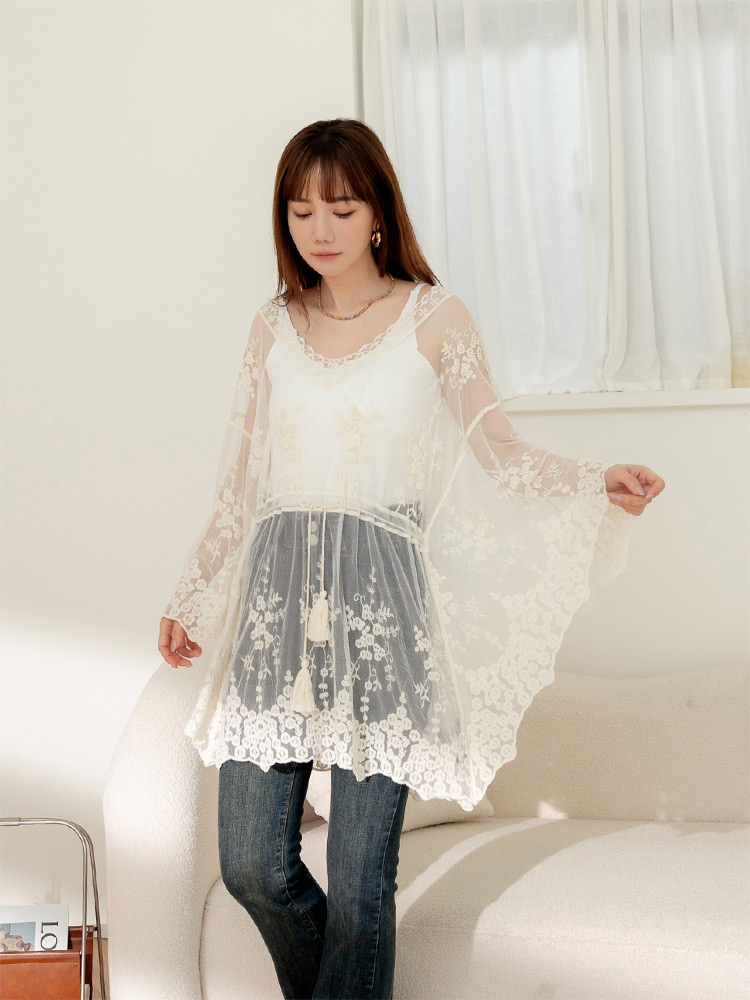 Cloud Cotton Embroidered Tie-Sleeve Top