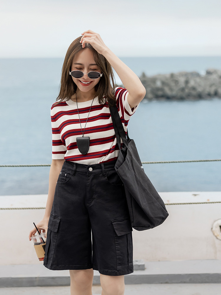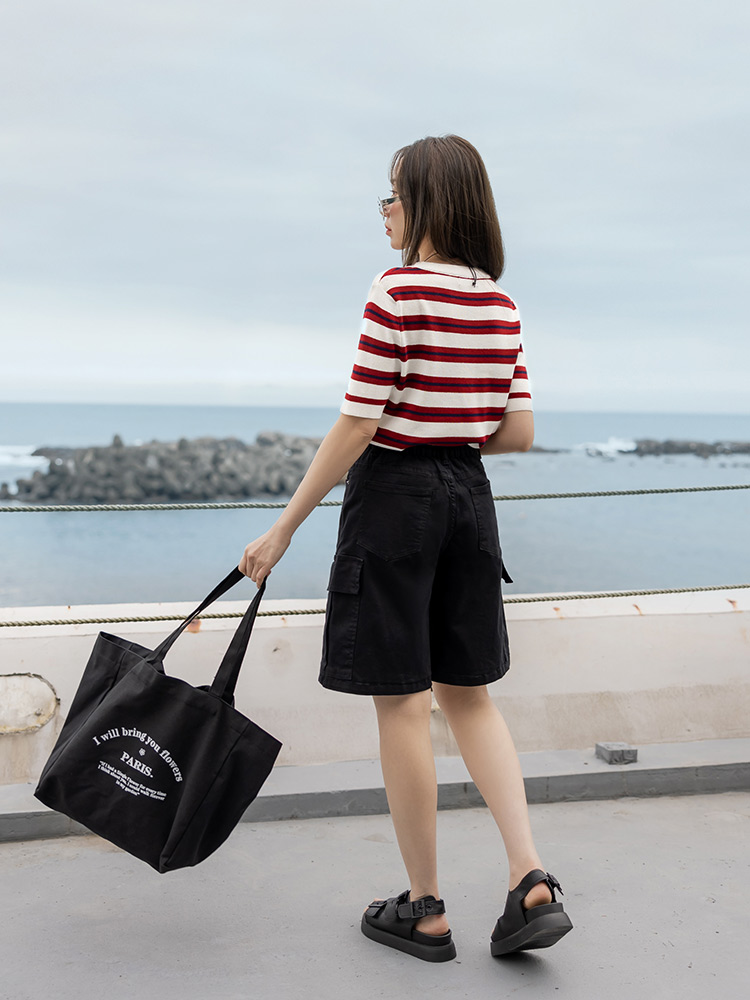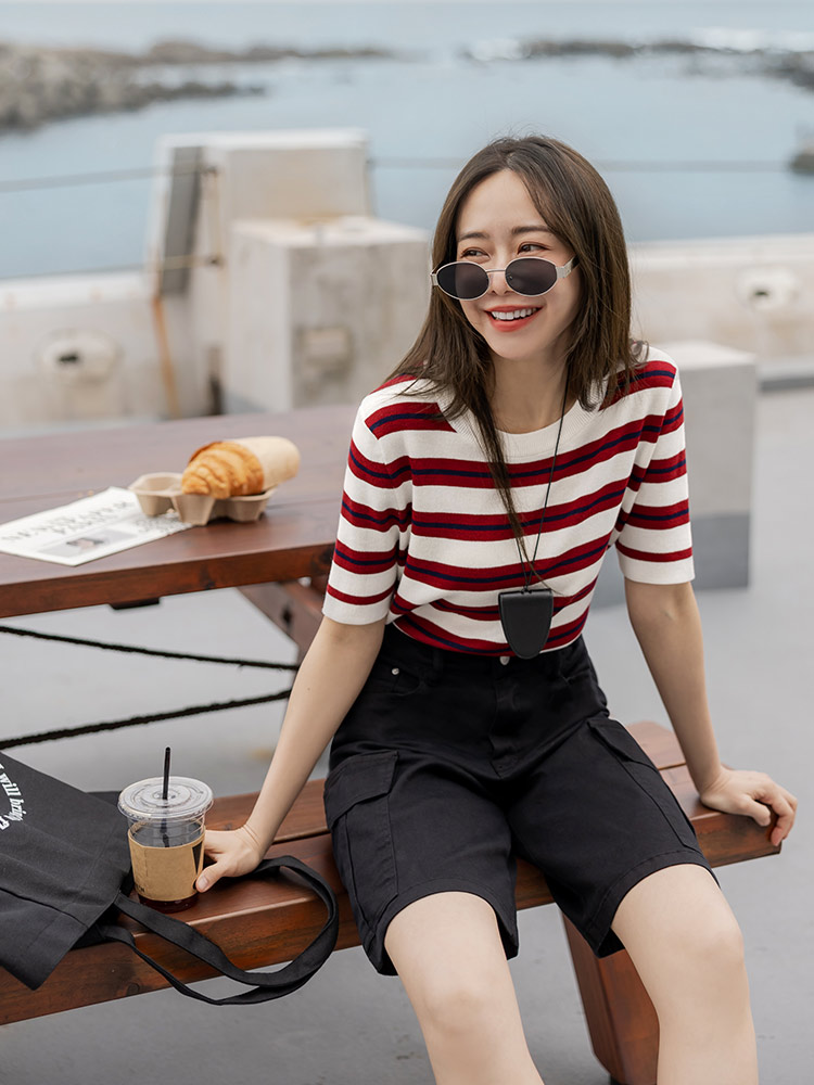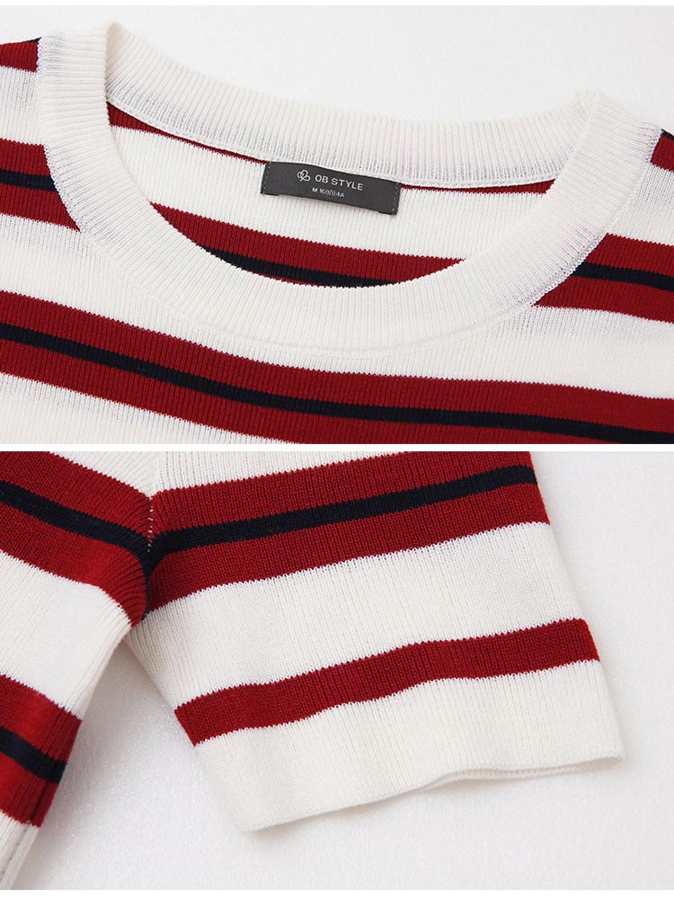 โ Crafted from a stretchy, striped knit fabric.
