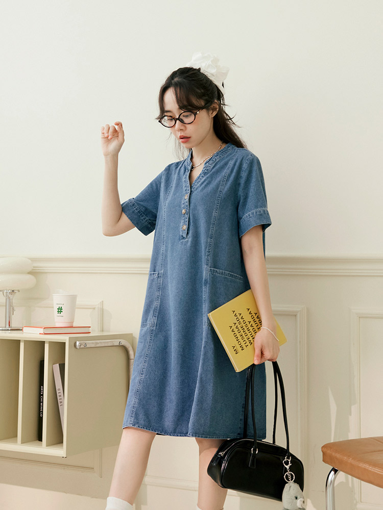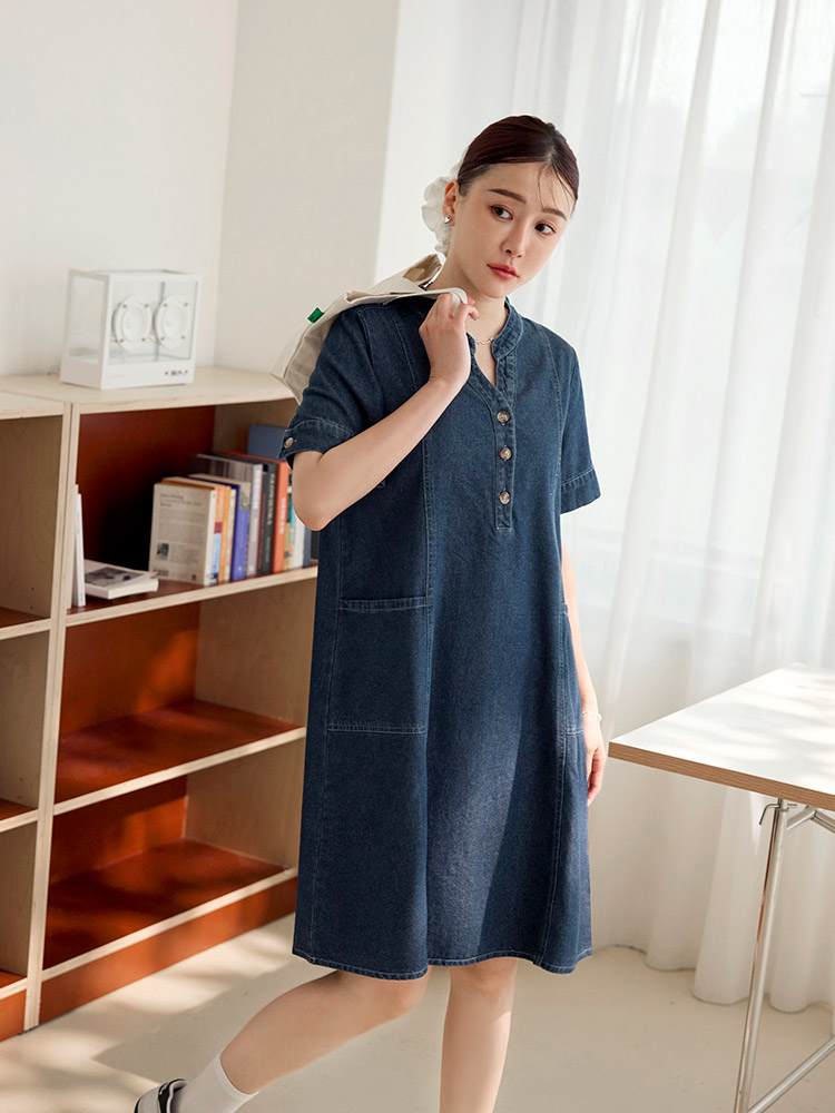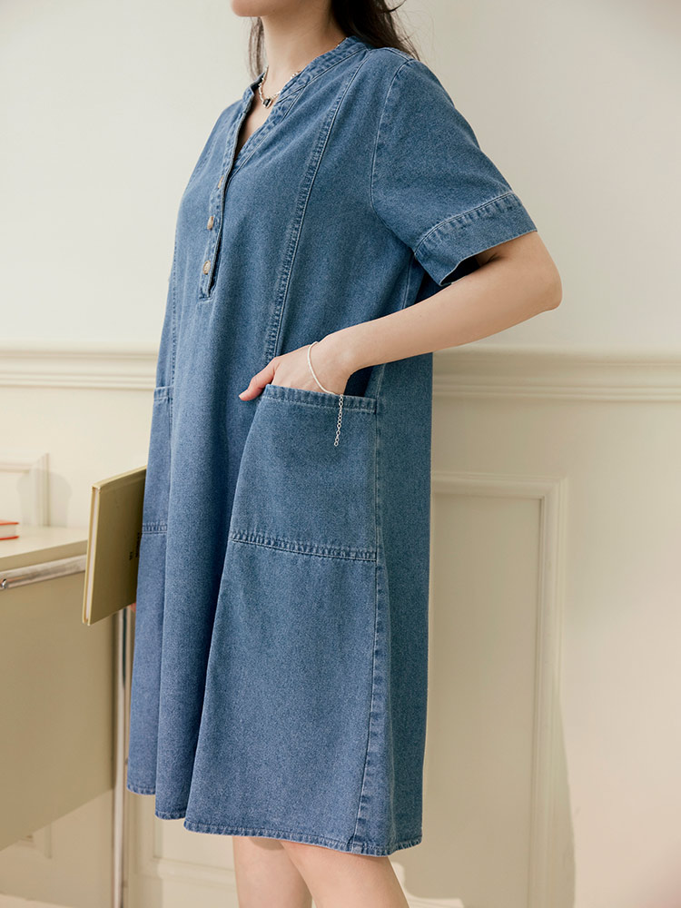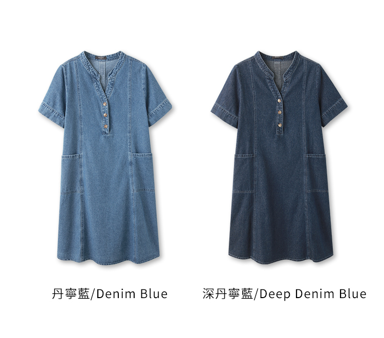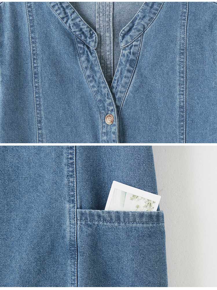 Product Feature: โ Crafted from breathable, pure cotton denim. โ Features a flattering V-neckline. โ Designed with functional front pockets. โ Includes a back-pleat cut to elongate the silhouette. โ Front placket and cuffs with opening buttons
