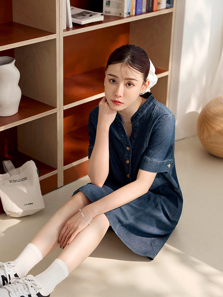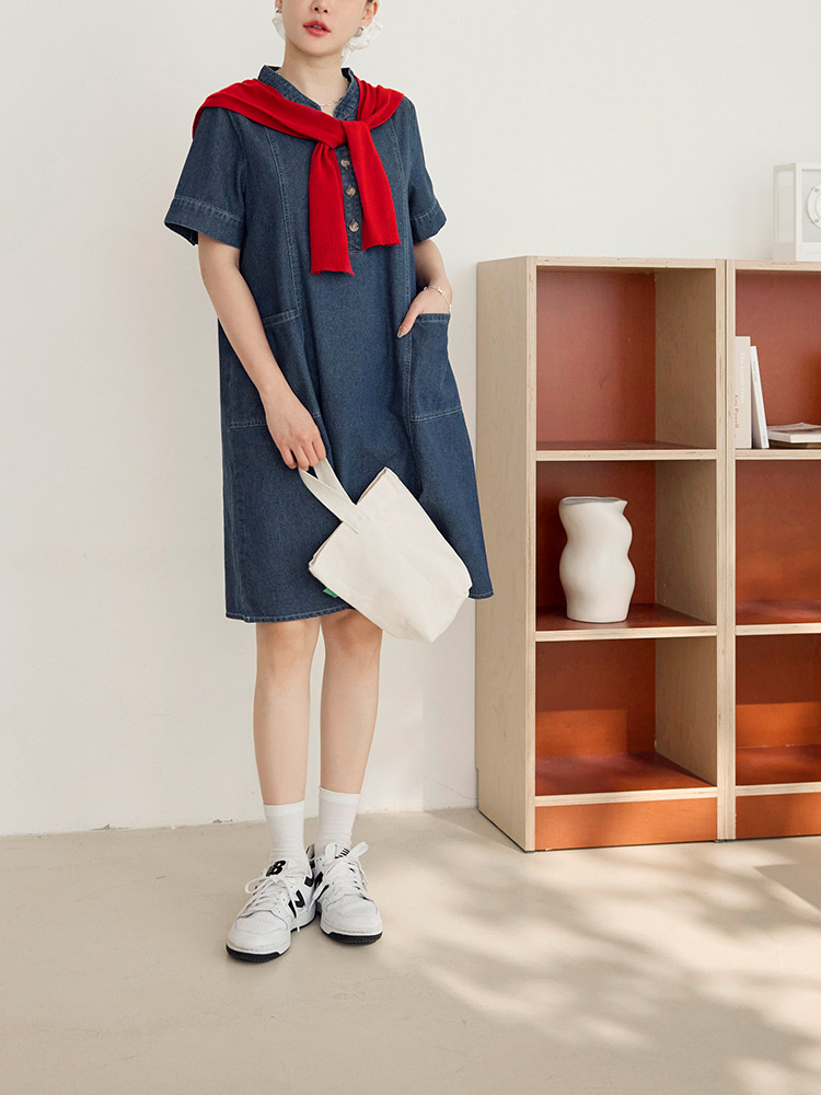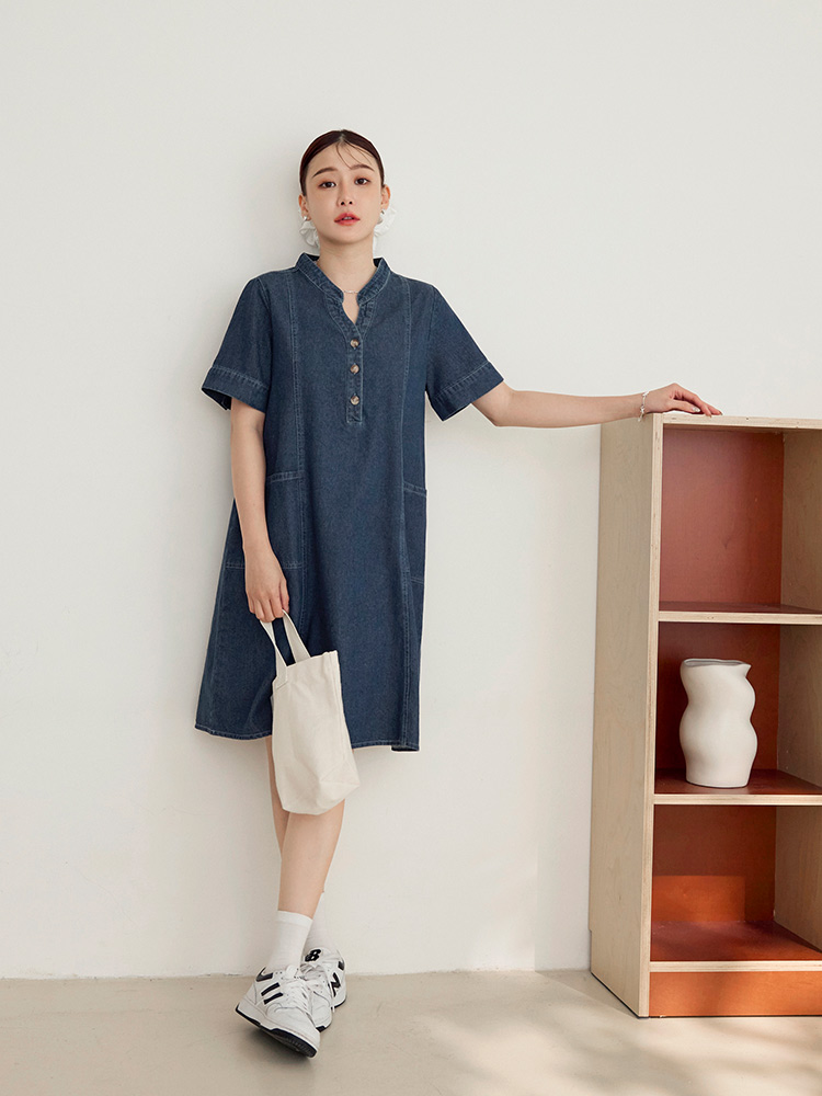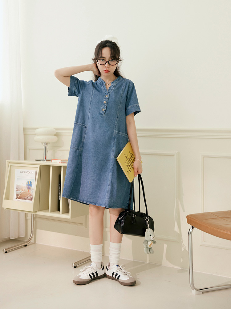 Product Feature: โ Crafted from breathable, pure cotton denim. โ Features a flattering V-neckline. โ Designed with functional front pockets. โ Includes a back-pleat cut to elongate the silhouette. โ Front placket and cuffs with opening buttons