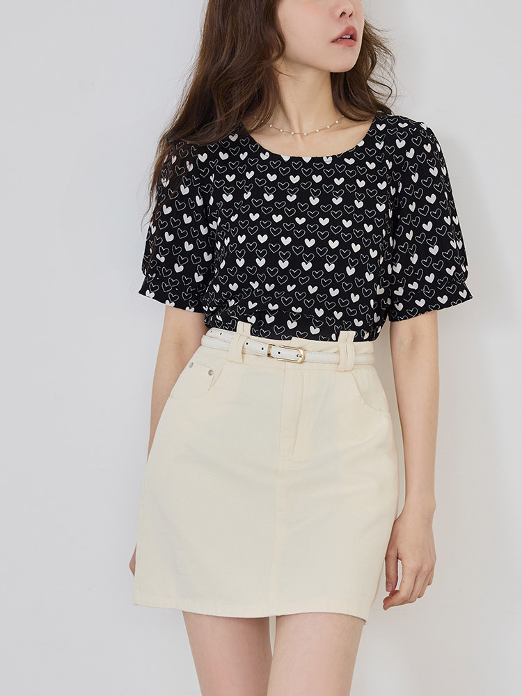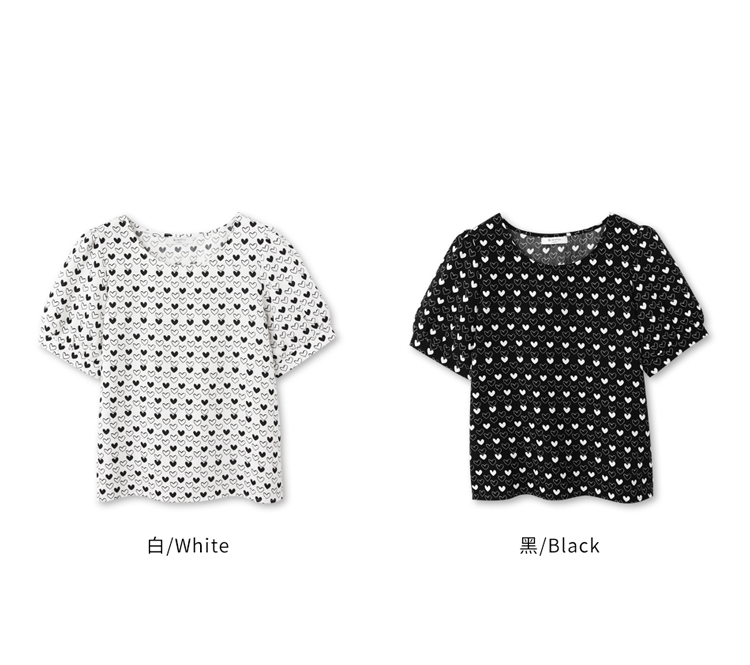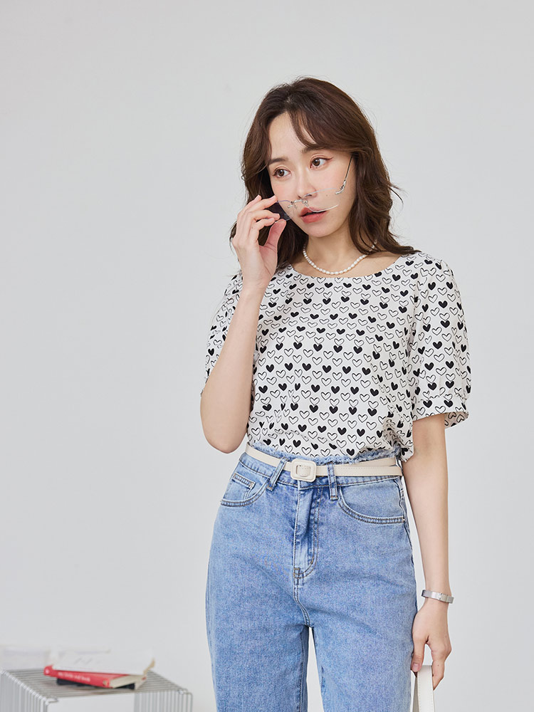 Wrinkle-Resistant Heart Print Puff Sleeve Top (XL~3XL)