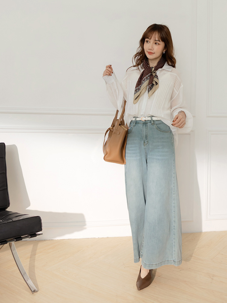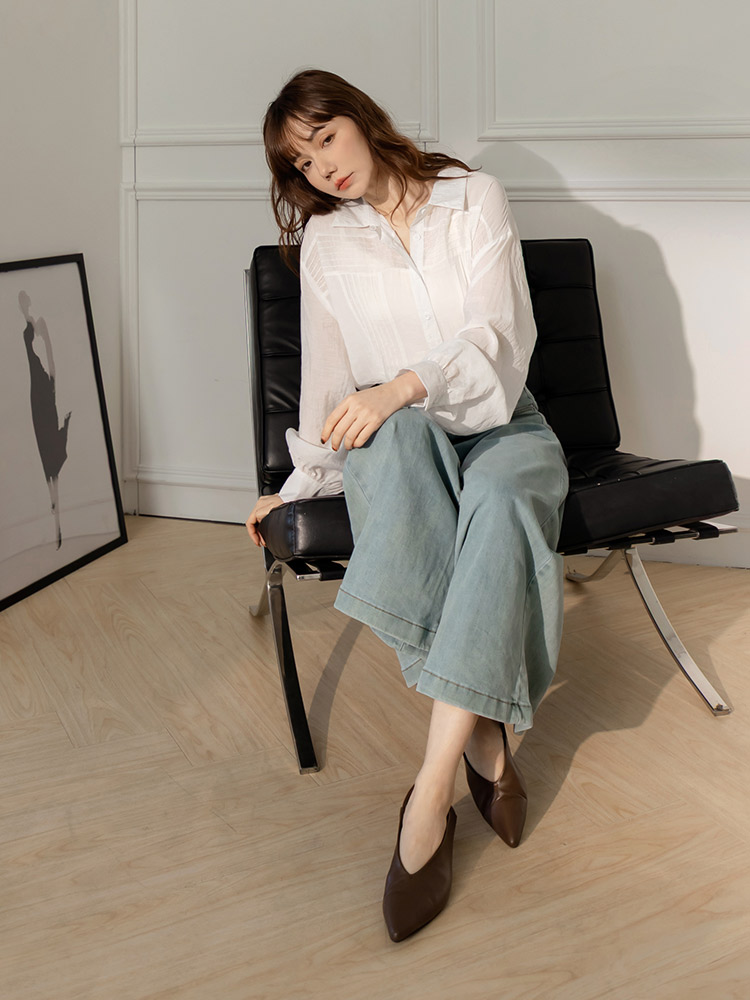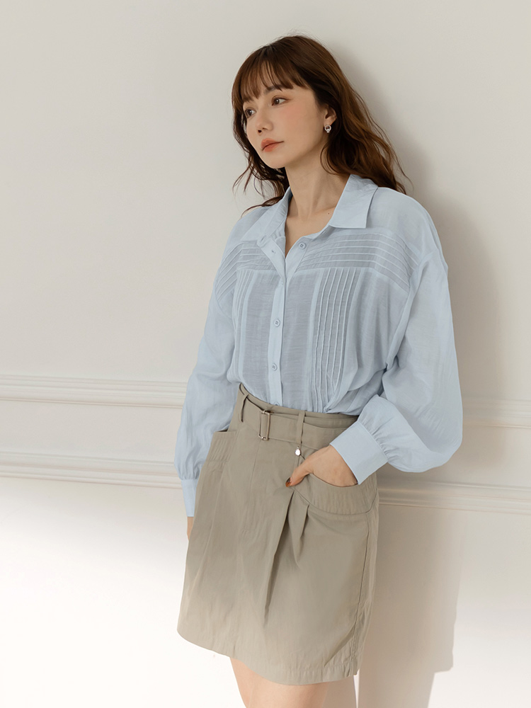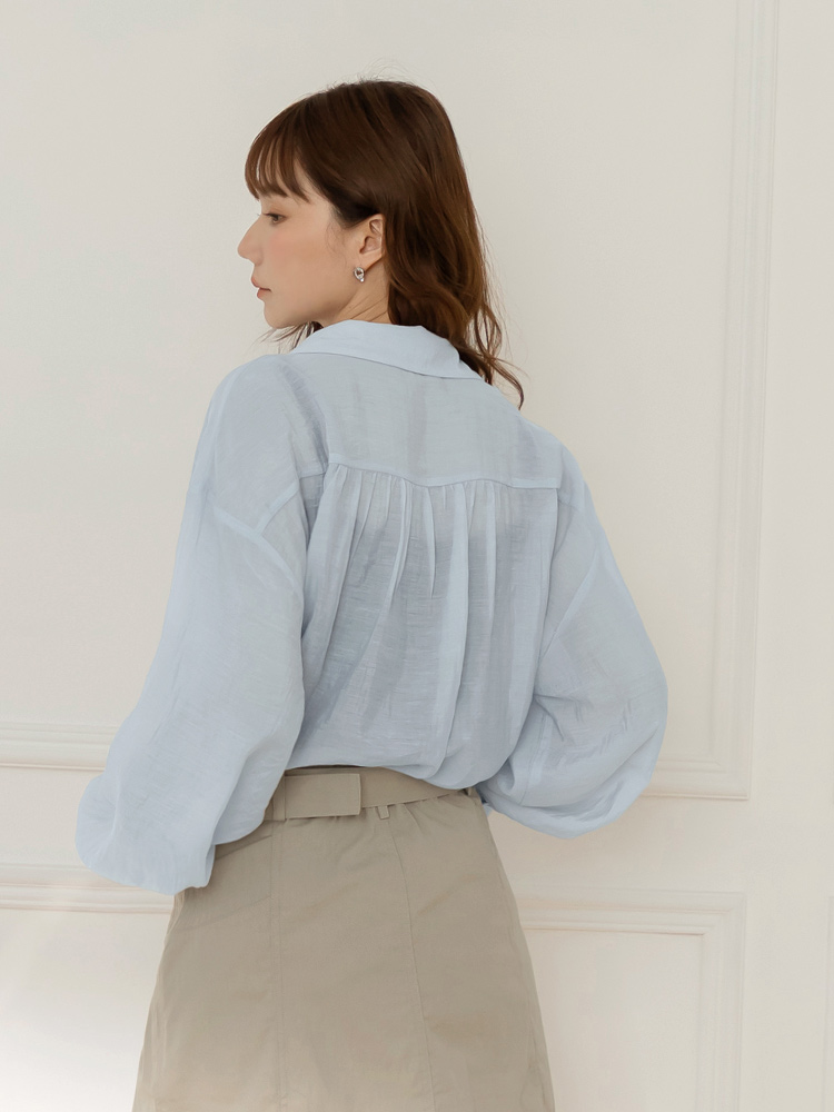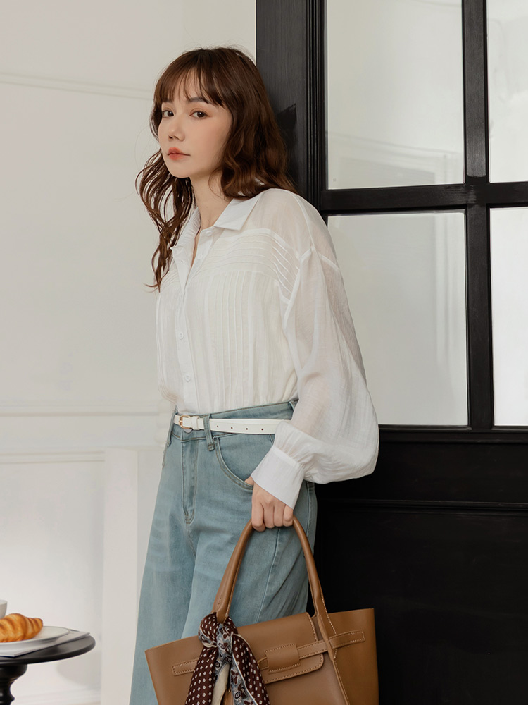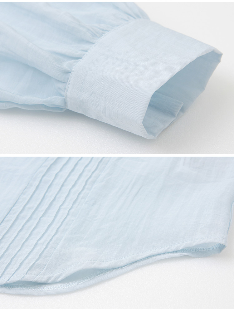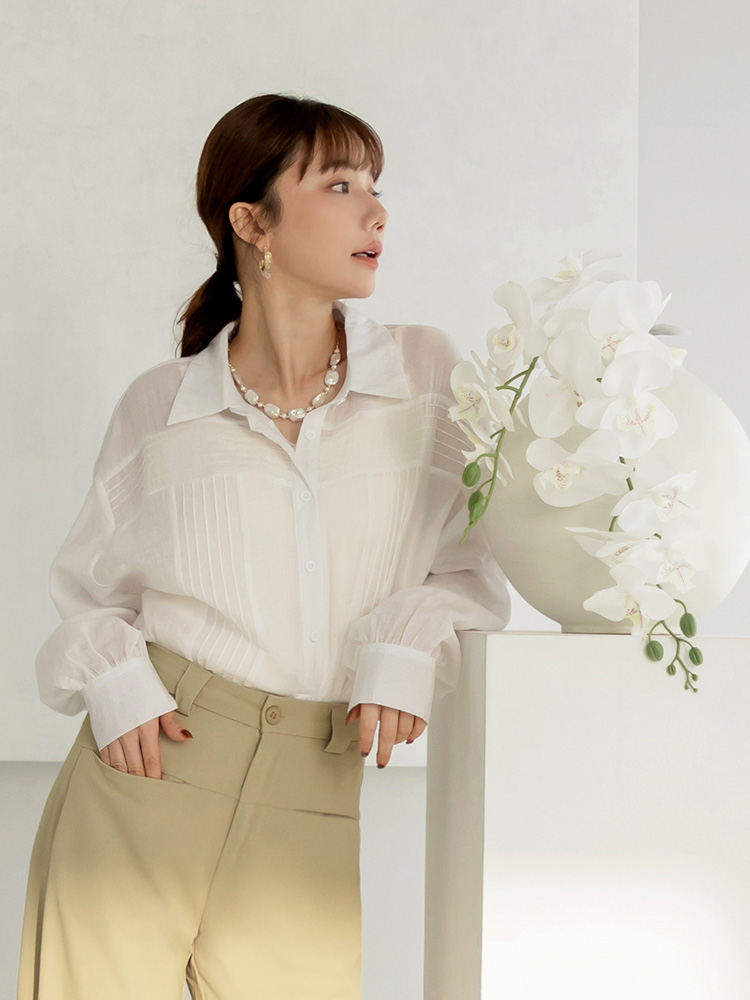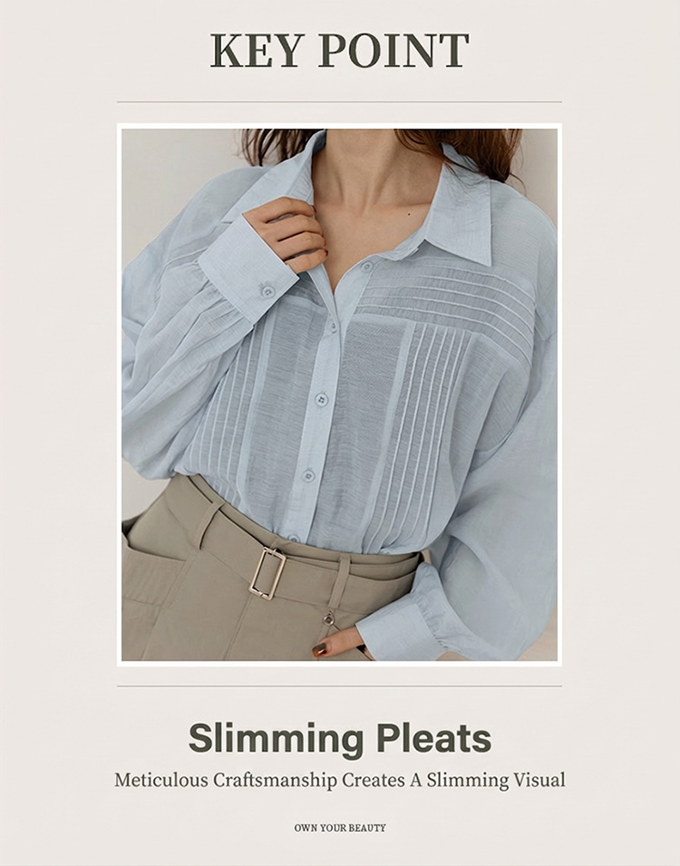 Product Feature: โ Features functional front buttons and cuff detailing. โ Crafted from a delicate, sheer, and comfortable fabric. โ Designed with flattering pleats for a visually slimming effect. โ Boasts a relaxed, dropped-shoulder fit for a comfortable, stylish silhouette.