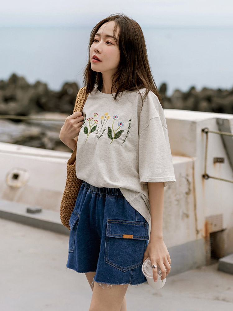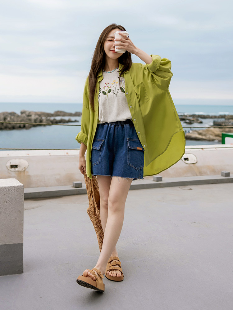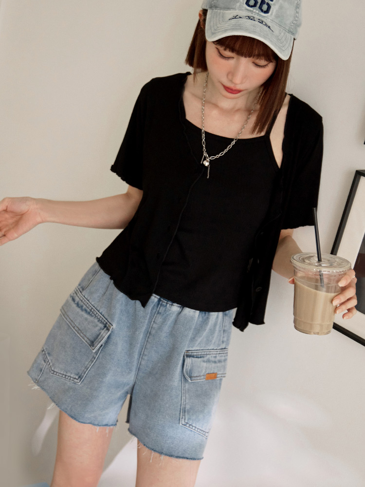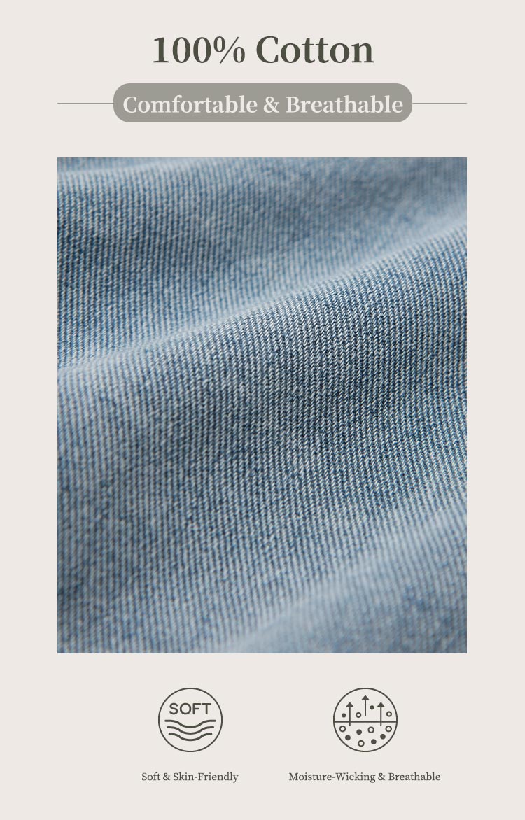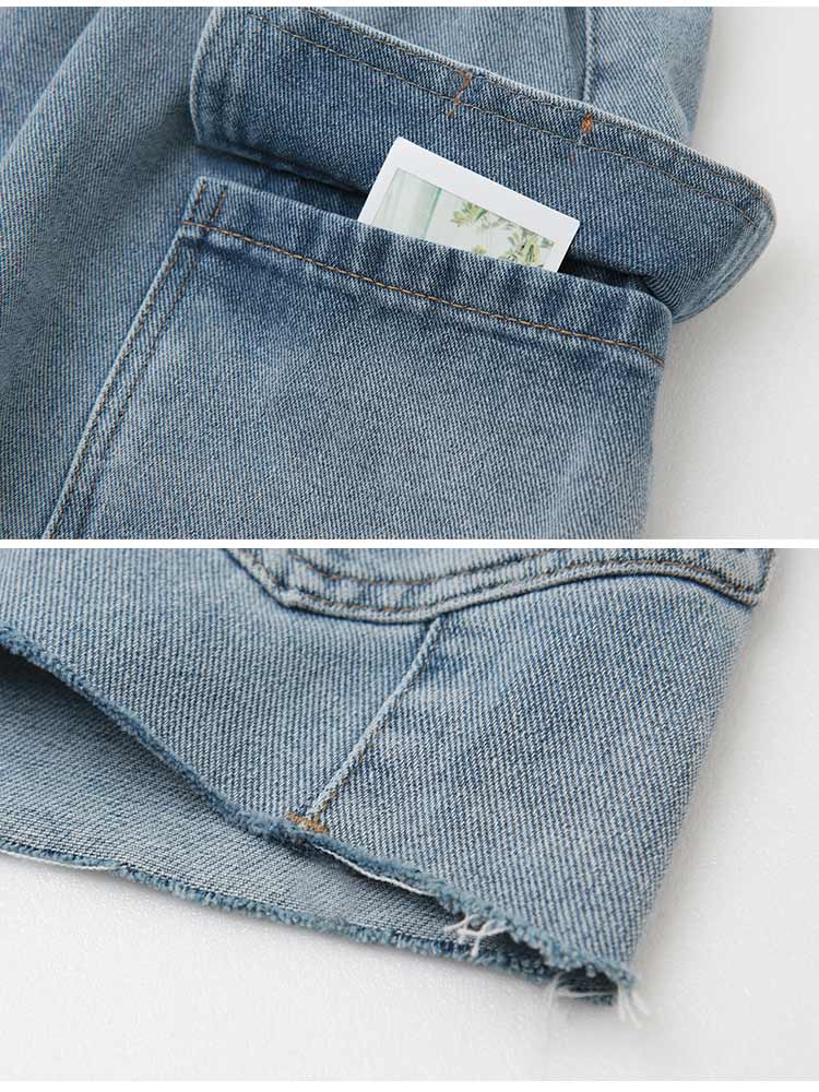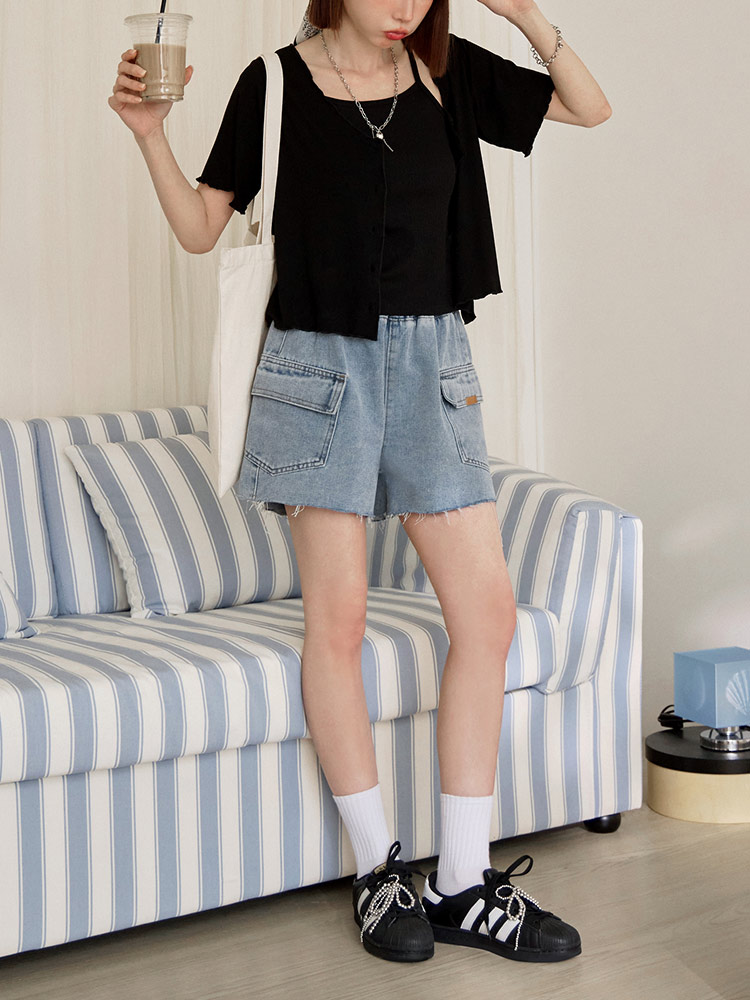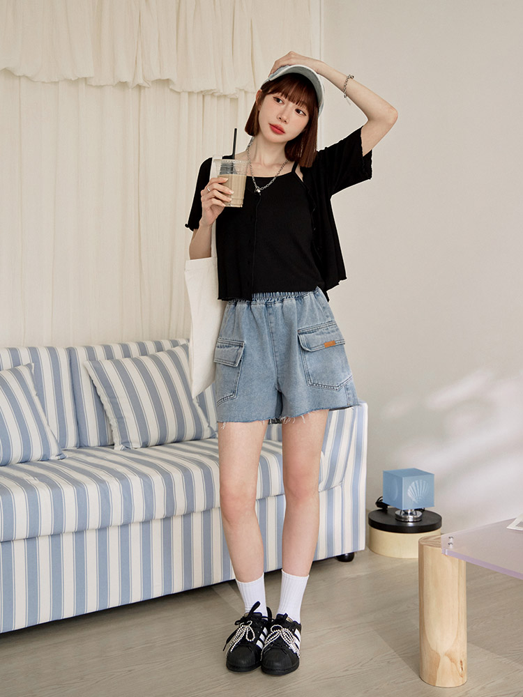 Product Feature: โ Crafted from comfortable pure cotton denim. โ Features functional front and back pockets, including stylish flap pockets. โ Equipped with a fully elasticated waistband for effortless comfort. โ Styled with a relaxed frayed hem for a casual aesthetic.