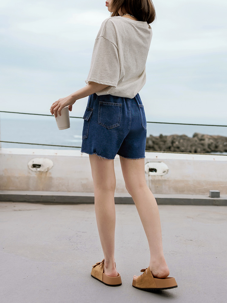 Pure Cotton Elastic Waist Frayed Hem Denim Shorts (2XL~5XL)