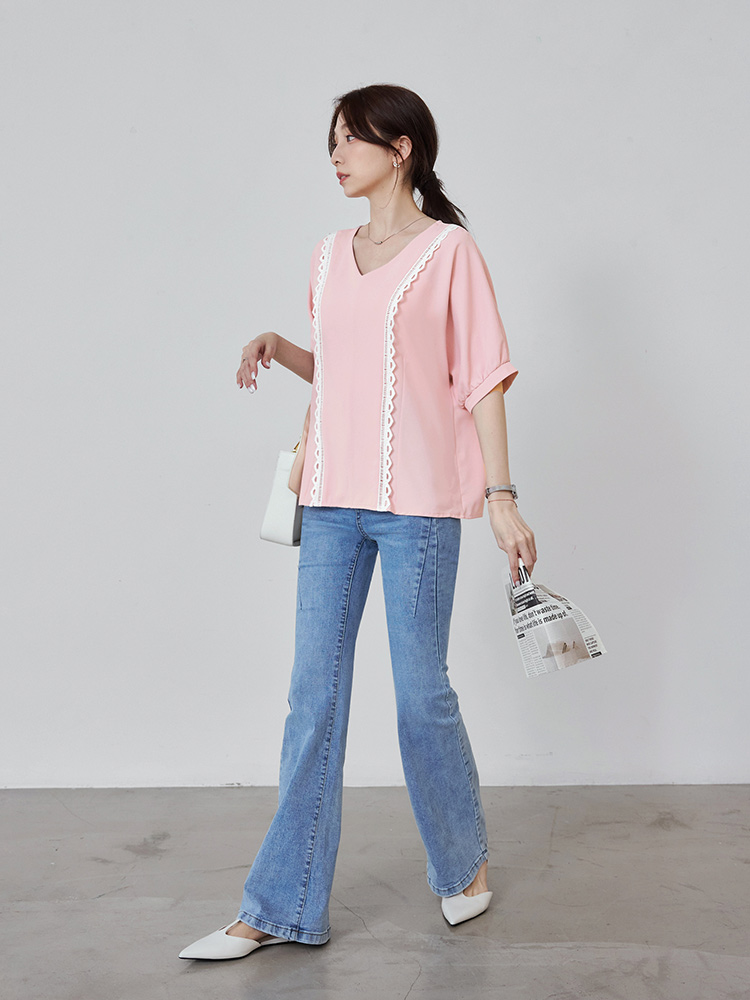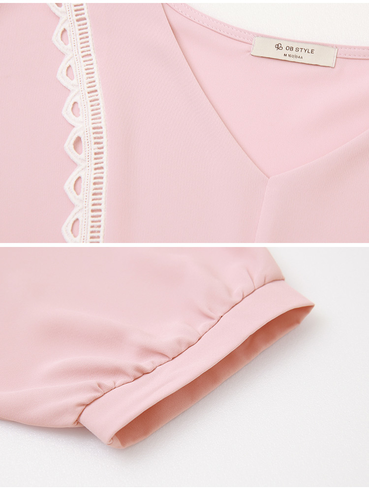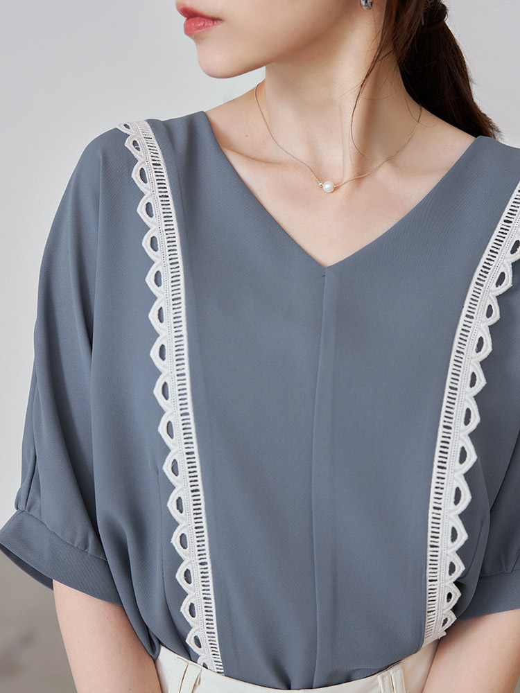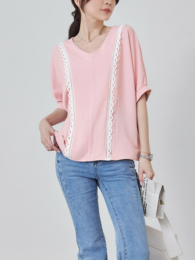 Wrinkle-Resistant V-Neck Lace Trim Elbow Sleeve Top (2XL~3XL)