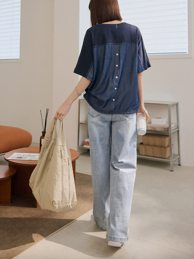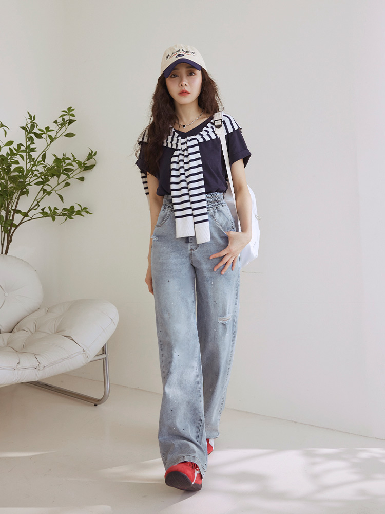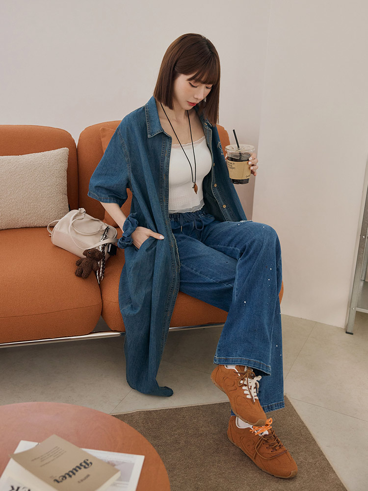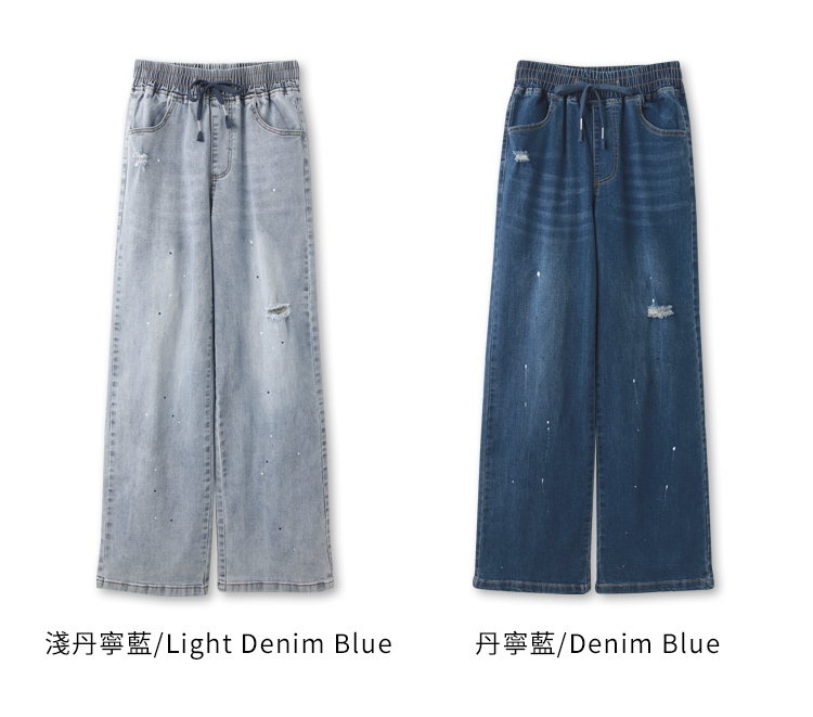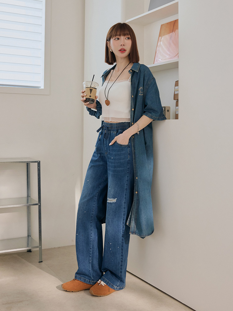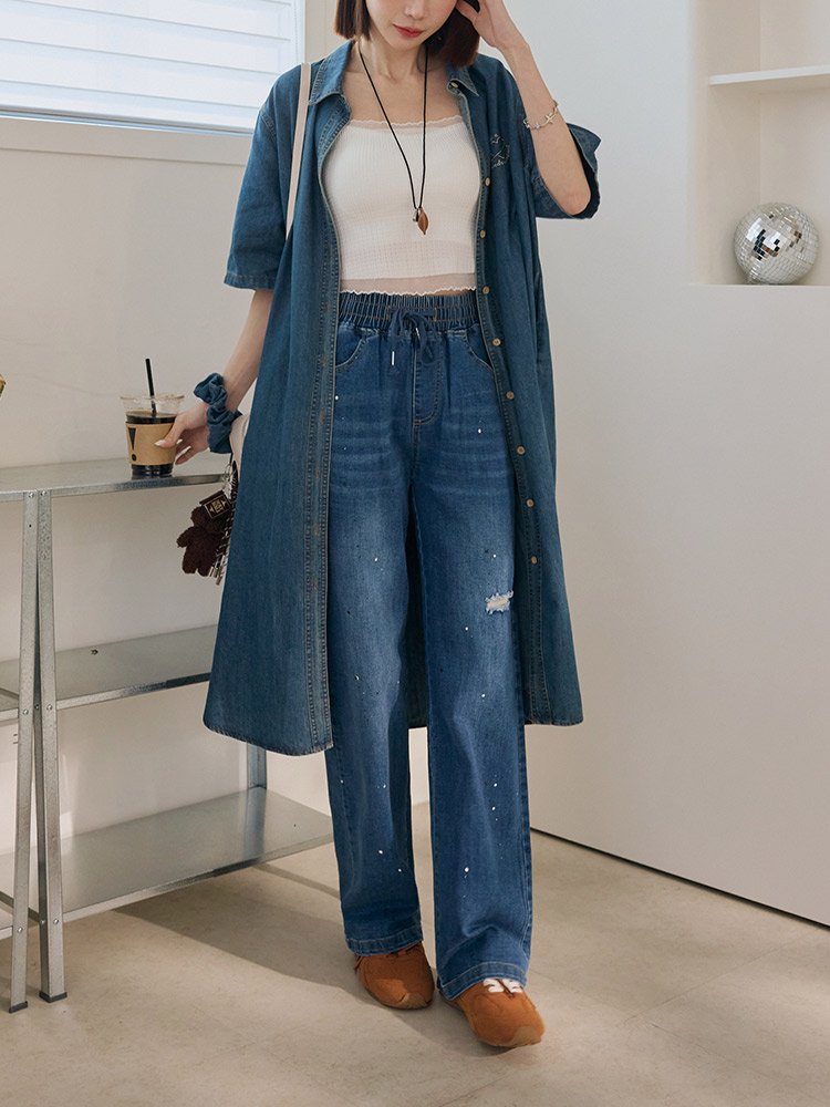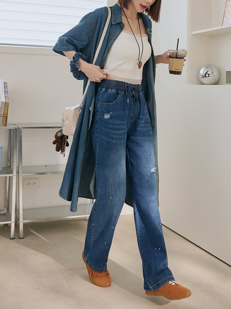 Product Feature: โ Made from comfortable cotton denim fabric. โ Features a full elasticated high-waist with an adjustable drawstring for a flattering, comfortable fit. โ Equipped with a functional button closure and practical front and back pockets. โ Straight-leg cut for a modern, flattering silhouette. โ Unlined design ensures a lightweight and comfortable wear.